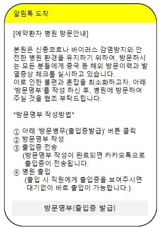 이에 한림대학교동탄성심병원은 당일 예약을 포함한 예약환자에게 모바일로 문진서 작성 메시지를 발송해 사전에 병원 방문 가능여부를 확인한 뒤 모바일로 출입증을 발급하고 있다. 아침 8시에 카카오톡을 통해 문진서 작성 메시지가 일괄 전송되며, 가족을 포함해 최근 2주간 해외방문 여부, 방문국가, 방문인 수 등을 입력하면 된다.