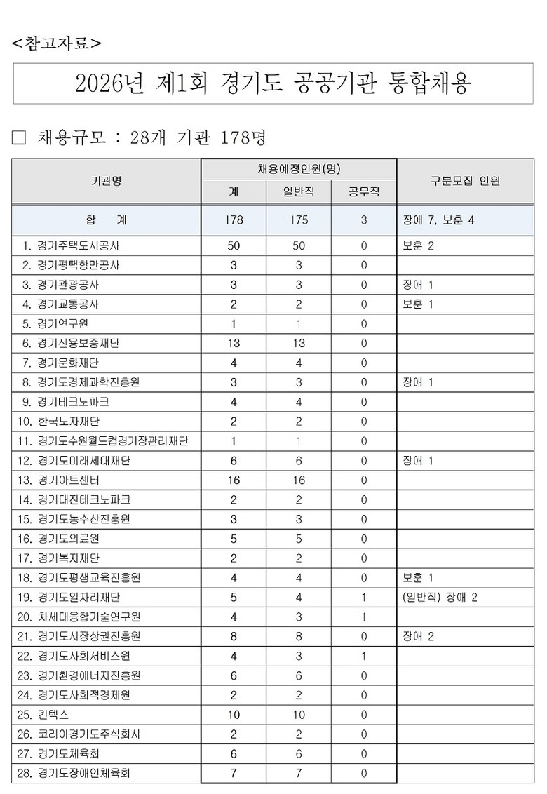 도는 이와 같은 내용을 담은 ‘2026년 제1회 경기도 공공기관 직원 통합채용시험 시행계획’을 경기도 누리집(gg.go.kr)과 각 기관 누리집에 20일 공고했다.