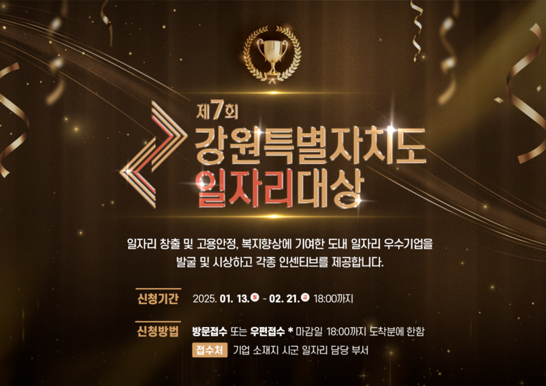 [강원도 세계타임즈=김민석 기자] 강원특별자치도(도지사 김진태, 이하 ‘도’)는 도내 우수 일자리 창출 기업을 발굴하고 시상하는 「제7회 강원특별자치도 일자리대상」 공모를 실시한다고 밝혔다. 이 사업은 올해 7회째로 G1방송, 강원특별자치도경제진흥원과 공동으로 추진하는 사업이다.