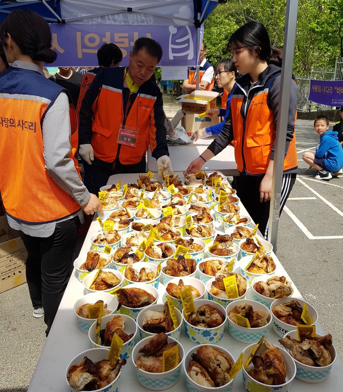 [대전=세계타임즈 이장성 기자] 대전광역시 봉사 단체 사단법인 사랑의 사다리 밴드(리더 이정제)의 회원 30명은 5일 오전9시, 제13회 와우키즈 페스티벌 행사장인 보성초등학교에서 바베큐통닭 120마리 봉사로 아이들에게 사랑을 나누었다.
