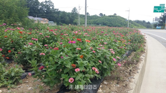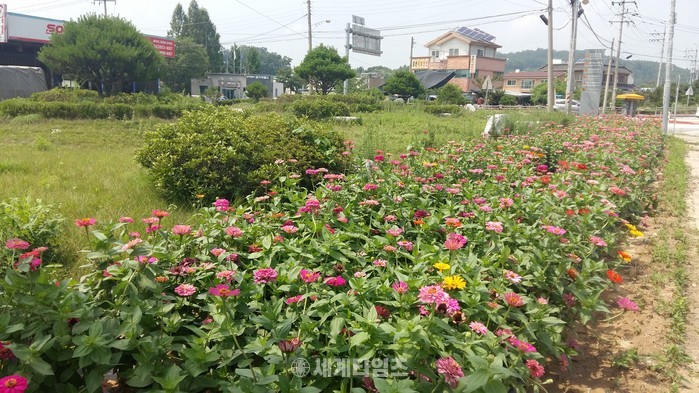 충주시 금가면과 주민자치위원회가 지난 5월 면소재지 입구 국도변 300m 구간과 유송교차로 인근 500m의 화단에 백일홍 꽃묘를 식재했다.