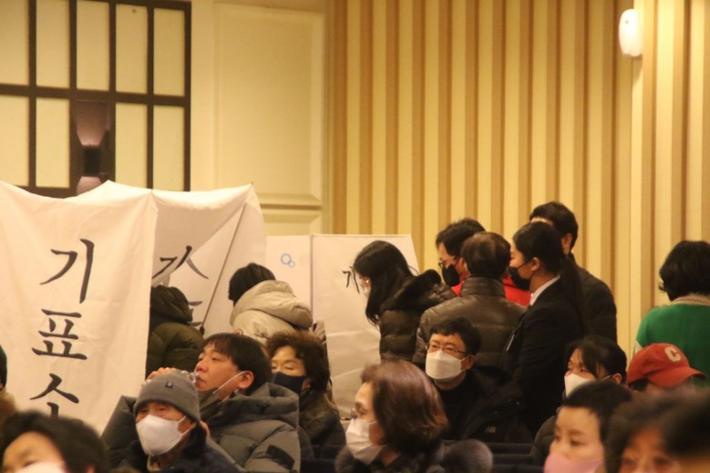 사회자는 "이견이 없는 의사 진행을 지켜봐 달라"며 거듭 당부 하면서 기표함을 재검점하는 등 진행요원의 서면결의서 집계 등을 사전 공지했다.