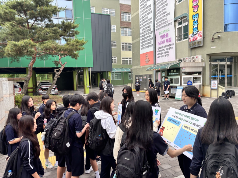 [대구 세계타임즈=한윤석 기자] 범물중학교(교장 김봉석)는 지난 5월 29일(목), 영어자율동아리 학생들과 굿네이버스 대구사업본부(사업본부장 한민희)와 함께 교내에서 기후 위기 대응을 위한 ‘Good Action’ 캠페인을 열었다. 이번 캠페인은 학생들이 직접 기후 문제 해결 방안을 제안하고 실천하는 활동으로 진행됐다.