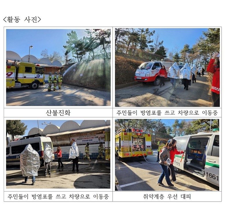 최근 건조한 날씨와 강풍 등 산불에 취약한 기상 여건이 지속됨에 따라, 초고속 확산이 우려되는 대형 산불 상황을 가정해 진행됐다. 지역주민 등 70여 명이 참여한 가운데 주민 대피와 재난경보 사이렌 가동 등 실전형 훈련으로 진행됐다.