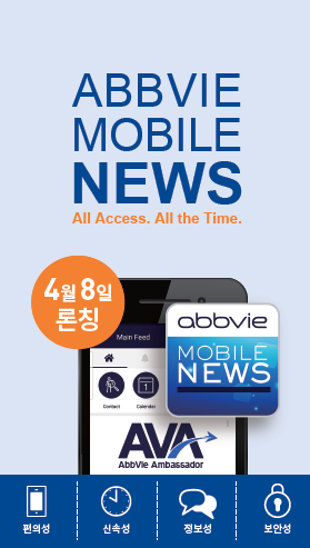 애브비 모바일 뉴스 앱은 모바일 기기를 통해 회사 소식과 다양한 정보를 언제 어디서나 간편하고 빠르게 찾아 바로 활용할 수 있도록 고안됐다. 회사와 브랜드, 파이프라인 관련 다양한 뉴스와 정보는 물론, 각종 행사와 일정 확인, 연락처 등을 직원들이 손안에서 편리하게 활용할 수 있도록 제공해 준다.