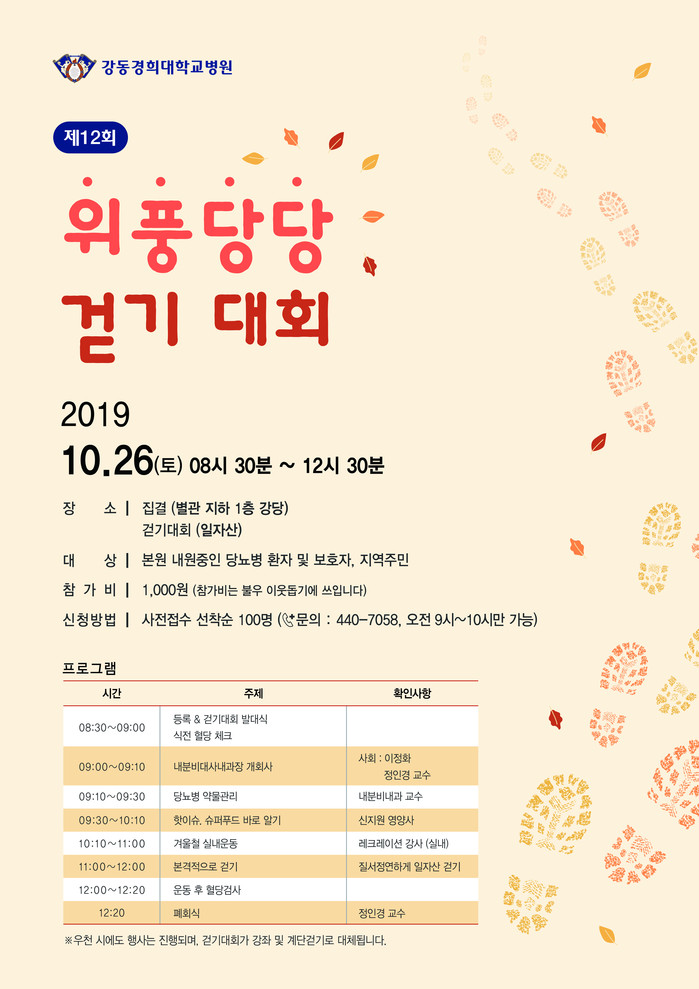 이날 행사는 당뇨병 주간을 맞이하여 내분비대사내과에서 진행중인 행사로, 올해 12회째를 맞는 걷기대회 행사다. 당뇨병 건강강좌와 걷기대회로 준비되며, 건강강좌 이전에 식전 혈당을 검사하게 된다. 건강강좌에서는 △당뇨병과 약물관리(내분비내과 교수), △핫이슈, 슈퍼푸드 바로 알기(신지원 영양사), △겨울철 실내운동 등의 강연이 진행된다.