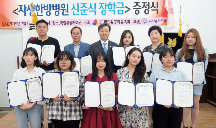 자생의료재단(이사장 박병모)은 지난 1일 서울 마포구에 위치한 독립유공자복지회관에서 독립유공자유족회 주관 ‘신준식 장학금’ 증정식이 열렸다고 2일 밝혔다. ‘신준식 장학금’은 자생의료재단이 지난 2월 개최한 ‘독립유공자 및 유가족 의료지원 선포식’에서 자생의료재단 신준식 명예이사장이 사재 1억원을 독립유공자유족회에 기탁하면서 마련됐다