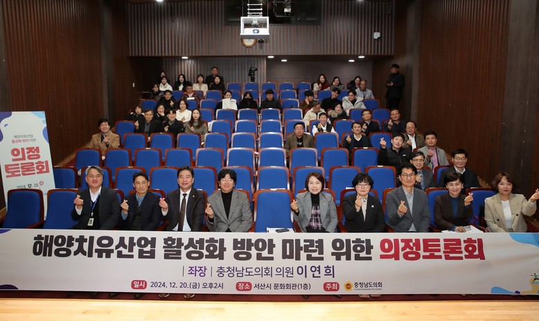[충남 세계타임즈=이현진 기자] 충남도의회는 20일 서산시 문화회관에서 ‘해양치유산업 활성화 방안 마련 의정토론회’를 개최하고, 지역 자연환경과 해양자원을 활용한 해양치유산업 방향 모색과 활성화 방향을 점검했다.