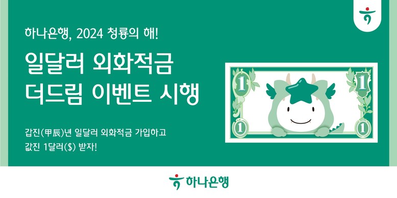 이번 이벤트를 통해 오는 2월 1일부터 7일까지 ‘일달러 외화적금’을 가입하는 손님에게 ‘1달러’를 추가로 입금해 주기로 했다. ‘1달러’ 추가 입금은 갑진년을 맞이하여 매일 선착순 2024명의 손님에게 제공된다.