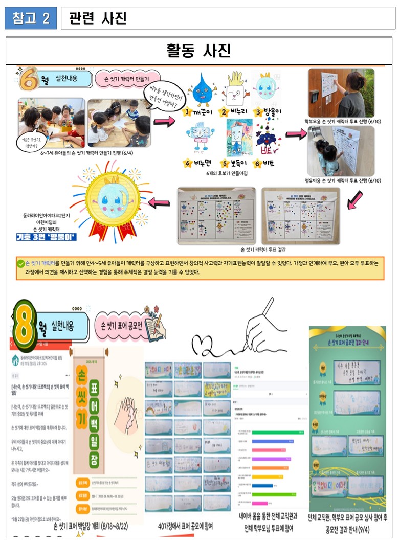 특히 손씻기 창작 노래, 율동, 그림책, 스티커 판, 창작 연극 등을 활용한 놀이형 손씻기 교육을 통해 아이들이 스스로 손씻기를 인식하고 실천하도록 유도했으며, 손씻기 교육이 가정으로까지 이어질 수 있도록 학부모와 연계한 손씻기 실천 활동을 적극 추진했다.