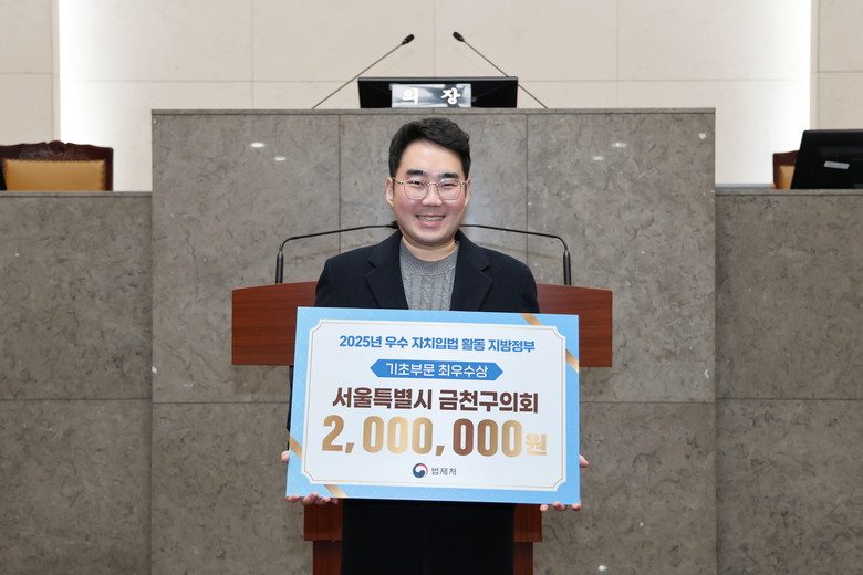 [금천구 세계타임즈=이장성 기자] 서울특별시 금천구의회가 18일 법제처가 주관한 ‘2025년도 우수 자치입법 활동 지방정부’ 선정에서 기초부문 최우수상을 수상했다. 이번 수상은 고영찬 금천구의원이 발의한 ‘청소년 건강·위생용품 지원 조례’가 우수조례로 선정된 데 따른 것으로, 금천구의회 출범 이후 최초의 법제처 최우수상이라는 점에서 의미가 크다.