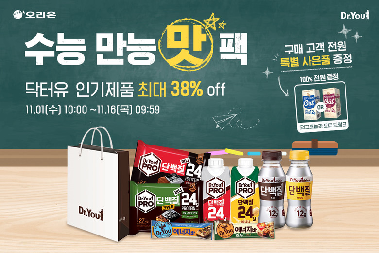 오는 11월 16일까지 닥터유몰에서 수능 만능 맛팩 구매 시 최대 38% 할인 혜택을 제공한다. 구매 고객에게는 식물성 단백질 12g이 들어 있는 ‘마켓오네이처 오!그래놀라 오트 드링크’도 증정한다.