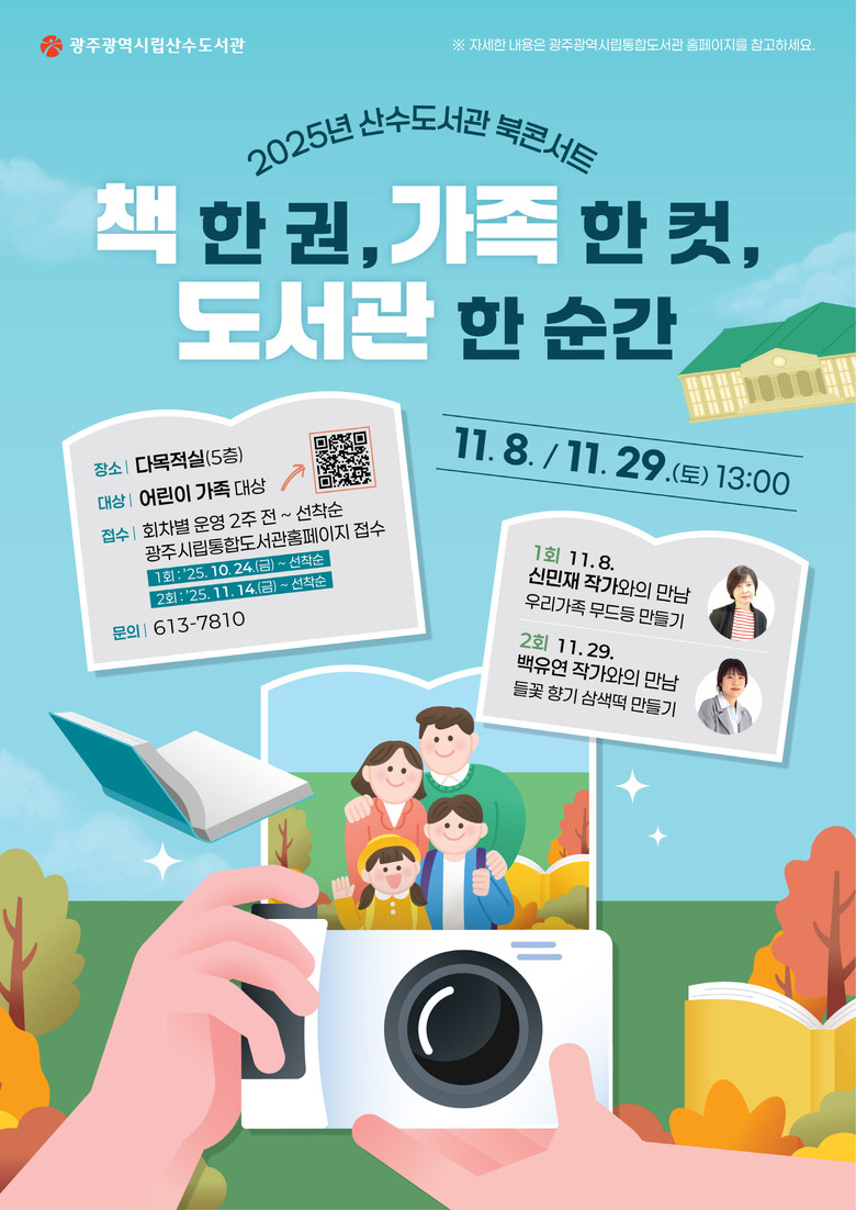 - 10월24일부터 온라인 접수…가족 중심 독서문화 확산 기대 [광주 세계타임즈=손권일 기자] 광주광역시립산수도서관이 오는 11월 8일과 29일 두 차례 ‘가족을 위한 북콘서트’를 개최한다.
