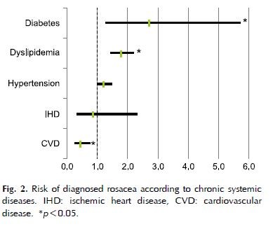 분석 결과, 당뇨와 이상지질혈증이 있는 환자는 주사 진단 확률이 각각 2.8배, 1.8배 높은 것으로 나타났다. 기전은 정확하게 밝혀져 있지는 않으나 유전적인 요인과 음주 등의 후천적 요인으로 인한 전신 만성질환이 주사를 유발할 뿐만 아니라 지질단백질의 구조적인 변화를 일으켜 이상지질혈증을 유발한다고 제시된 바 있다. 반면 허혈성심질환을 앓고 있는 환자군에서는 주사 진단율이 높아지지 않는 것으로 나타났다.