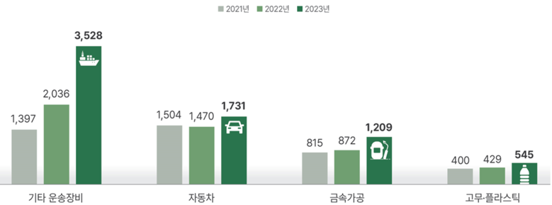 이 가운데 광업·제조업 근로자의 증가가 두드러졌다. 2023년 임금근로자는 9,068명으로 전년보다 2,601명(40.2%) 증가한 것으로 나타났다. 산업 중분류에 따른 구성비는 ‘기타 운송장비 제조업’이 3,528명(38.9%)으로 가장 많았고, 이어 ‘자동차 제조업’1,731명(19.1%), ‘금속가공업’ 1,209명(13.3%) 등의 순으로 나타났다.