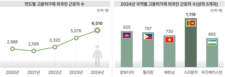 2024년 울산의 ‘고용허가제(E-9) 외국인 근로자’는 6,510명으로 전년 대비 1,434명(28.3%) 증가한 것으로 나타났다. 2020년 2,988명이었던 점과 비교하면 2배 이상 증가한 수치다.