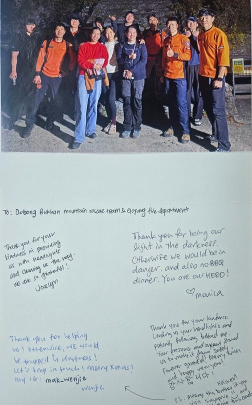 9일 경기도북부소방재난본부에 따르면 지난해 11월 북한산에서 조명 장비 없이 야간 하산을 시도하다 조난을 당한 싱가포르 국적 관광객 4명이 지난달 말 고양소방서에 감사 편지를 보냈다.