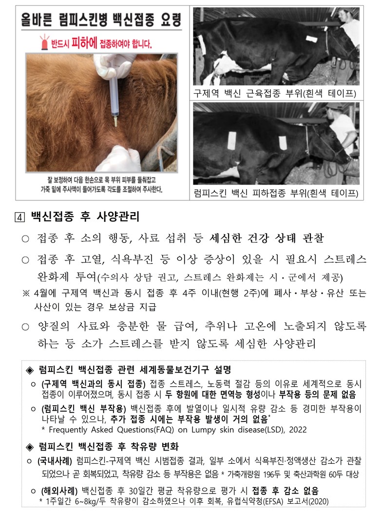 ❷ 아픈 소, 90일령 이하 등 접종 유예 대상은 접종 사유 소멸 시 매월 접종 [강원도 세계타임즈=김민석 기자] 강원특별자치도(도지사 김진태)는 4월 1일부터 4월 14일까지 2주간, 도내 소 사육 농가 6,200여 호, 총 25만 두(소규모 4,600호 7만 9천 두, 전업 1,600호 17만 1천 두)를 대상으로 럼피스킨 백신 일제접종을 실시한다고 밝혔다.