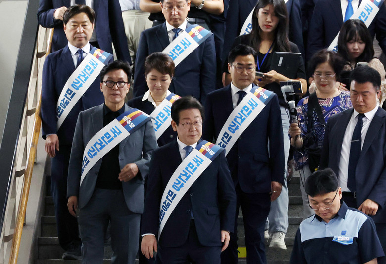[세계타임즈 = 신상철 기자] 더불어민주당 이재명 대표와 박찬대 원내대표 등 의원들이 13일 오전 서울 용산역에서 추석 귀성 인사를 하기 위해 플랫폼으로 들어서고 있다. 2024.9.13 [공동취재]