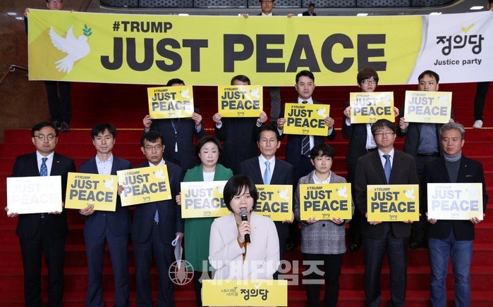 [세계타임즈 이채봉 기자]정의당은 6일 도널드 트럼프 미국 대통령의 방한과 관련해 "한반도에 항구적인 평화체제를 가져올 비전을 제시하라"며 북핵문제에 대한 평화적인 해법을 주문했다.