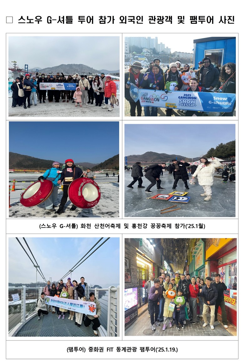 도는 ‘2018 평창 동계올림픽’과 ‘2024 강원 동계청소년올림픽대회’를 성공적으로 개최하며 대한민국 동계관광의 메카(Mecca)로 자리 잡았다. 이번에는 도내 겨울축제(6개 시군, 7개 축제)와 스키리조트(6개 시군, 8개 시설)를 연계한 관광상품과 한류 드라마 촬영지 및 전통시장을 연계해, 외국인 관광객 2,000여 명 유치를 목표로, 강원형 동계 특화 관광상품 ‘스노우 G(Ganwon)-셔틀버스’를 운영한다.