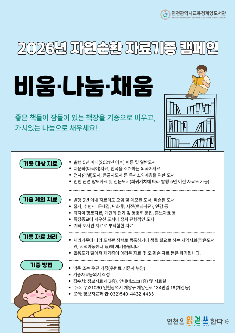 이번 캠페인은 가정과 기관에 잠자고 있는 도서를 기증받아 계양도서관 장서로 활용하거나 작은도서관·지역아동센터 등 지역사회에 재기증함으로써 기증, 나눔, 활용이 선순환되는 독서생태계 조성을 목표로 한다.