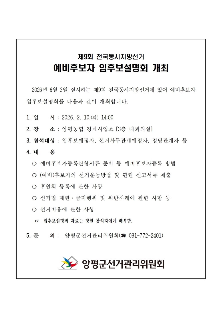 입후보설명회 개최 관련 기타 궁금한 사항은 양평군선거관리위원회(☎ 031-772-2401)로 문의하면 된다.