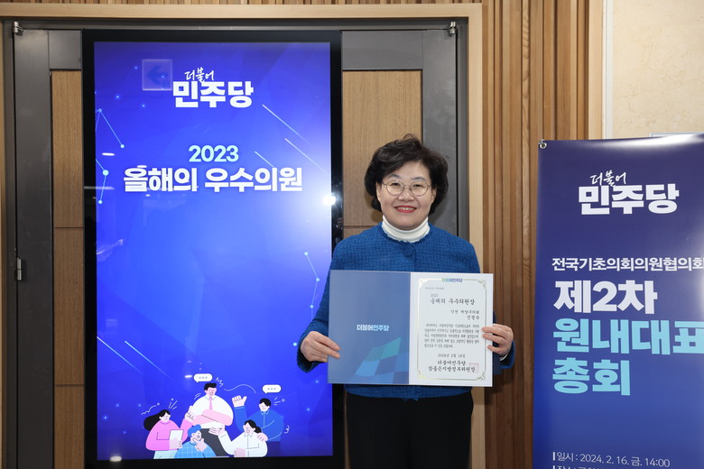 [계양구 세계타임즈=심하린 기자] 인천 계양구의회 신정숙 의원은 지난 16일 더불어민주당 참좋은지방정부위원장(박완희 상임대표)으로부터 더불어민주당 제2회 기초의회 원내대표 총회에서 ‘올해의 우수의원상’을 전달 받았다.