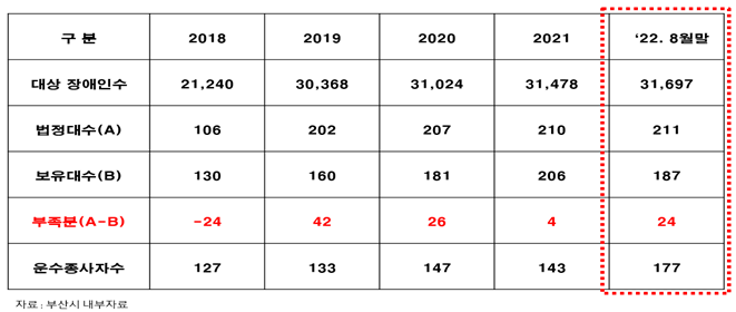 2022년 8월 기준으로 두리발 이용 대상 장애인 수는 31,697명으로 법정대수 211대가 필요하나, 부산시 보유대수는 187대에 운수종사원은 177명에 불과하여 법정대수 부족에 운수종사원은 차량보다 부족하다고 지적하였다.