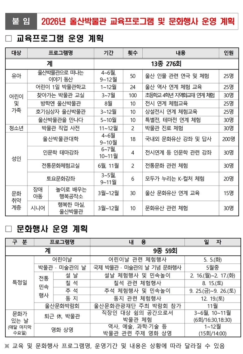 한편 2026년 울산박물관 교육 및 문화행사 관련 세부 내용은 울산박물관 누리집(www.ulsan.go.kr/s/museum)을 통해 시기별로 안내될 예정이다.