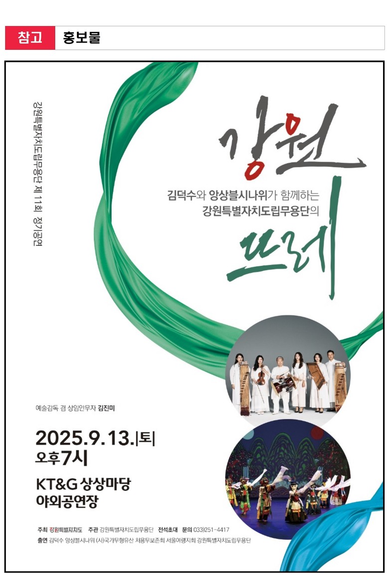 공연은 전석 무료이며, 기타 자세한 사항은 강원특별자치도립무용단(☎033-251-4417)으로 문의하면 된다.