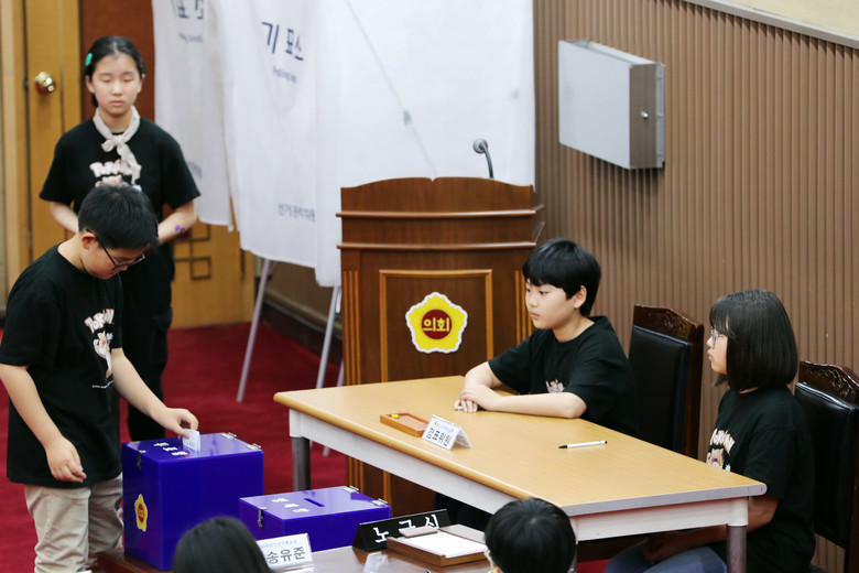 1일 도의원이 된 학생들은 본회의장에서 무기명 투표를 통해 청소년 의장을 선출하고 ‘제한적 노키즈(No-Kids)존 설치 허용 조례안’과 ‘음식물 쓰레기 배출 감소 마일리지 건의안’, ‘학교 앞 대각선 사거리 설치 건의안’ 등 안건 3건을 심의‧의결했다.