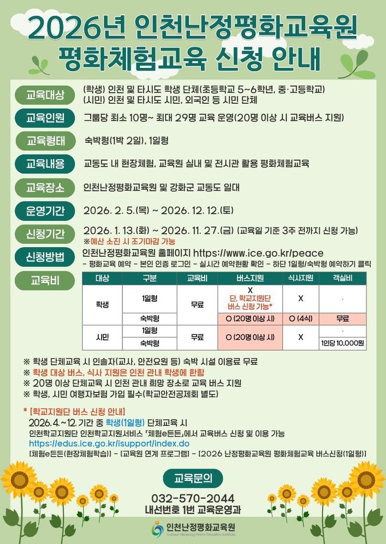 프로그램에 대한 자세한 사항은 난정평화교육원 누리집에서 확인하거나 교육운영과(032-621-9956)로 문의하면 된다.