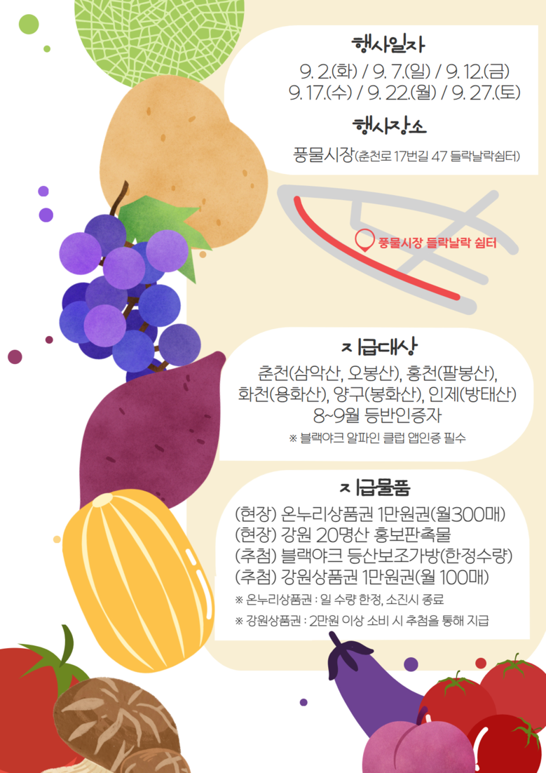본 이벤트는 8~9월 중 춘천 풍물시장 인근의 △삼악산(춘천) △오봉산(춘천) △팔봉산(홍천) △용화산(화천) △봉화산(양구) △방태산(인제)을 등반 후 장날 풍물시장에 방문하면 다양한 혜택을 받을 수 있다.