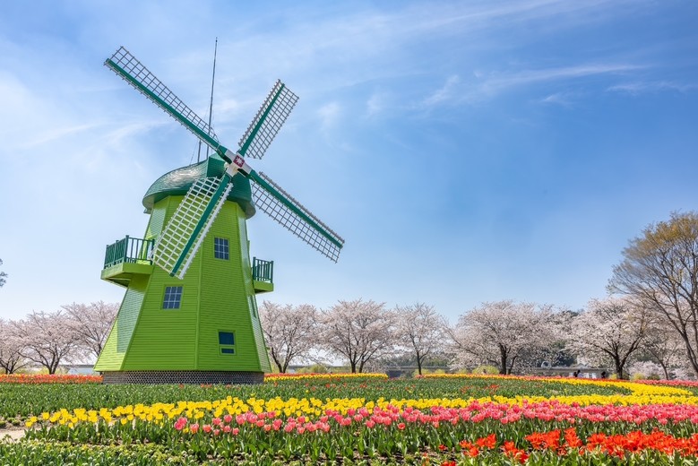 따사로운 봄 햇살 아래 형형색색의 튤립이 만개해 정원을 화사하게 물들이고 있다.