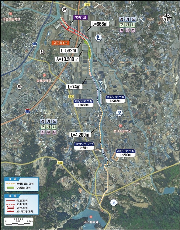 정비사업은 포천시 소흘읍 고모리에서 가산면 일원까지 총 연장 4.1km 구간을 대상으로 추진된다. 하천 제방 1.26km 보강을 통해 고모천의 홍수 대응 능력을 우선 개선하고 하천 유휴지를 활용하여 수변공원과 산책로를 조성해 주민들이 안전하게 이용할 수 있도록 하는 사업이다.