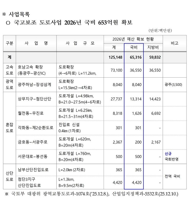 광주광역시(시장 강기정)는 2026년도 도로사업 정부 예산 653억원을 확보, 총 1251억원을 투입해 9건의 도로 사업을 진행한다고 29일 밝혔다.