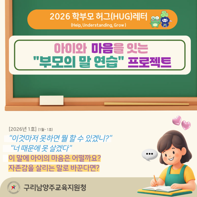 ◦ 따뜻한 언어 습관을 통한 자녀 자존감 향상과 관계 회복 [남양주시 세계타임즈=송민수 기자] 구리남양주교육지원청(교육장 서은경)은 2026년, 가정 내 긍정적 소통 문화를 확산하고 부모-자녀 관계의 정서적 연결을 강화하기 위해 학부모 허그(HUG)레터 「아이와 마음을 잇는 부모의 말 연습 프로젝트」를 매달 발행할 예정이다.(HUG-Help, Understanding, Grow)