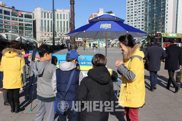 이날 3호선 화정역 광장을 지나던 시민들은 영하 추위 가운데서도 시몬지파 홍보단서 진행하는 교리비교 체험 부스에 발걸음을 멈춰 홍보단원들에게 신천지예수교회에서 진행하는 전단지 및 교리비교 콘텐츠에 대해 질문했다.