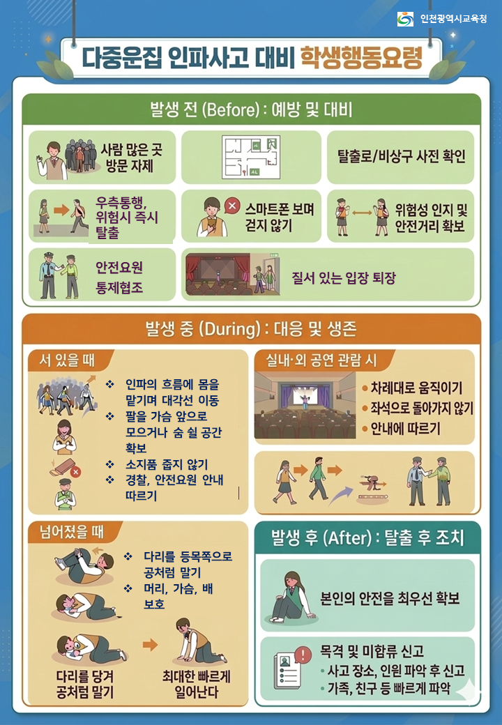 시교육청 관계자는 "학생들의 안전이 무엇보다 최우선"이라며 "경찰청 등 유관기관과 협력해 대규모 인파 밀집 등 다양한 위기 상황에 선제적으로 대응하고 사고 예방에 최선을 다하겠다"고 말했다.