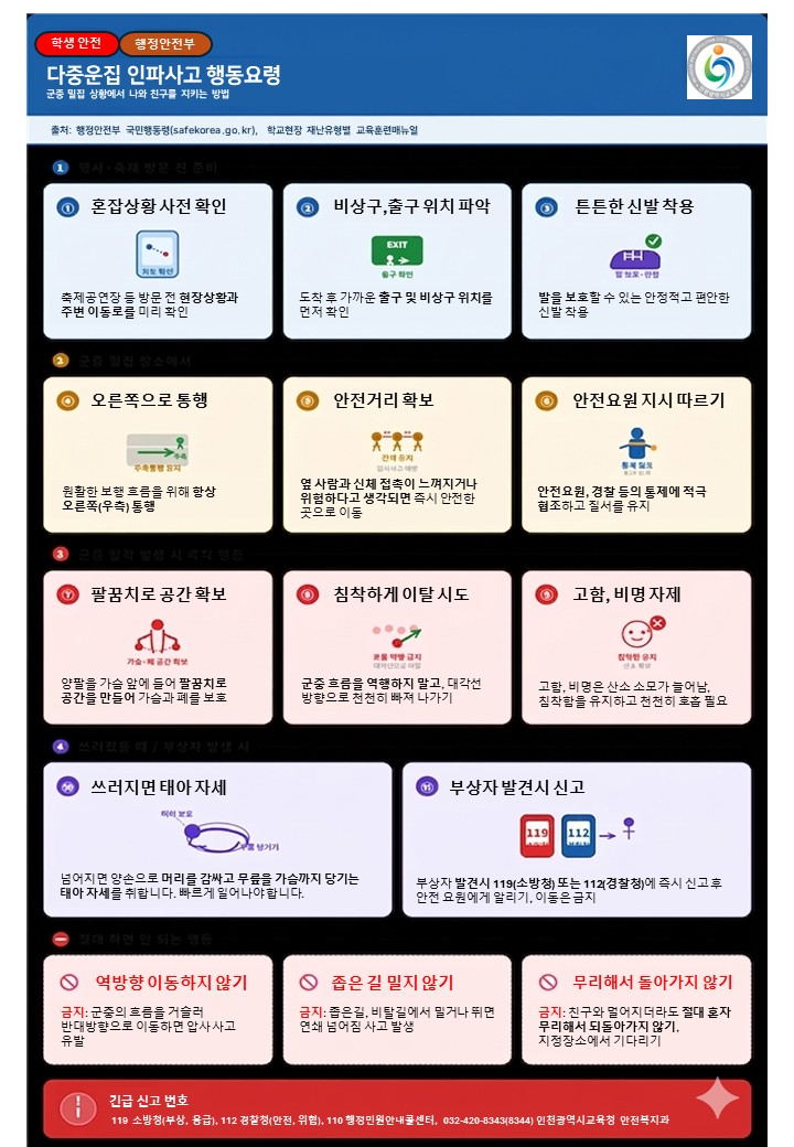 시교육청은 각 가정과 학교에 상황별 대응 지침이 담긴 ‘다중운집 인파사고 대비 행동요령’을 배포했으며, 학생과 연락이 두절되거나 위급 상황이 발생할 경우 즉시 112(실종·범죄) 또는 119(안전사고·부상)로 신고하도록 안내하는 등 예방 활동에 나섰다.