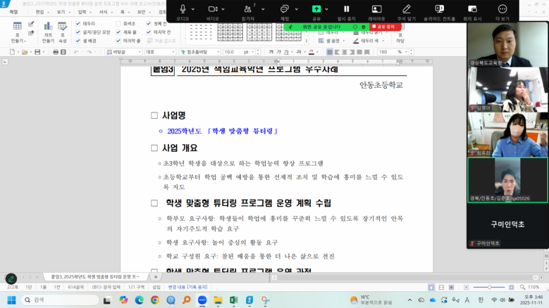 이번 컨설팅은 대면 회의로 인한 학교의 업무 부담을 줄이면서도 교육 결손 해소 사업 운영의 내실화를 도모하기 위해 추진됐으며, 초등학교 3교와 중학교 2교 등 총 5교가 참여해 현장의 실천 경험을 공유하고 발전적 운영 방안을 함께 모색했다.