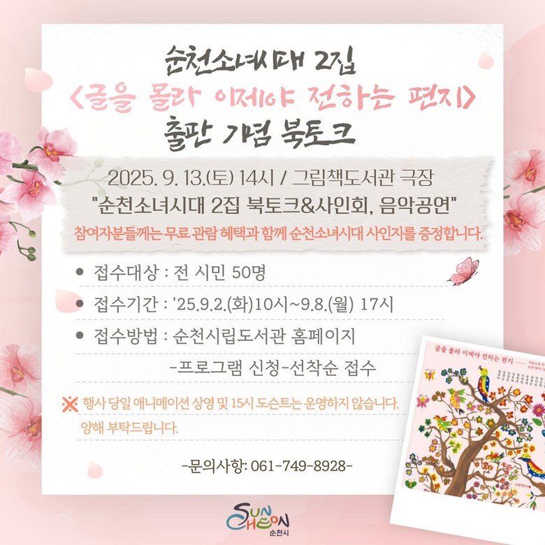 [순천시 세계타임즈=우덕현 기자] 순천시(시장 노관규)는 오는 13일 오후 2시, 순천그림책도서관에서 『글을 몰라 이제야 전하는 편지』 출간을 기념한 북토크 행사를 개최한다고 밝혔다.
