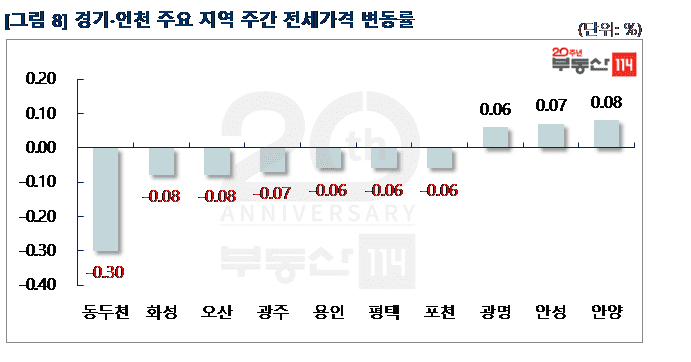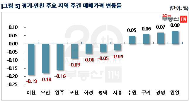 경기ㆍ인천은 ▼동두천(-0.30%) ▼화성(-0.08%) ▼오산(-0.08%) ▼광주(-0.07%) ▼용인(-0.06%) 순으로 떨어졌다. 동두천은 송내동 송내주공4단지 소형면적이 250만원 하락했다. 화성은 진안동 주공그린빌10·11단지가 250만원-1,500만원 떨어졌다. 반면 △안양(0.08%) △안성(0.07%) △광명(0.06%) 등은 올랐다. 안양은 안양동 래미안안양메가트리아가 500만원-1,000만원 상승했다. 안성은 공도읍 벽산블루밍디자인시티가 250만원 올랐다.