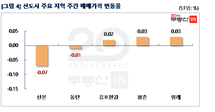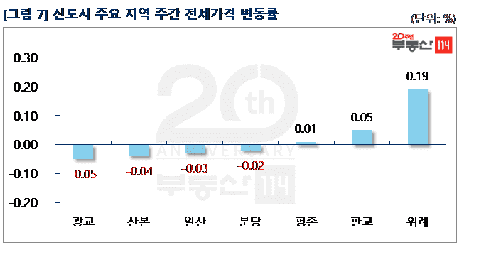 신도시는 ▼광교(-0.05%) ▼산본(-0.04%) ▼일산(-0.03%) ▼분당(-0.02%) 순으로 떨어졌다. 광교는 원천동 광교중흥S클래스 2,231가구 입주 영향으로 전세가격이 약세를 나타냈다. 하동 힐스테이트광교가 500만원 하락했다. 산본은 금정동 율곡3단지와 퇴계3단지주공이 500만원-1,500만원 떨어졌다. 반면 △위례(0.19%) △판교(0.05%) △평촌(0.01%) 등은 상승했다. 위례는 학암동 위례롯데캐슬, 장지동 위례IPARK1차, 창곡동 위례호반베르디움이 500만원-750만원 상승했다.
