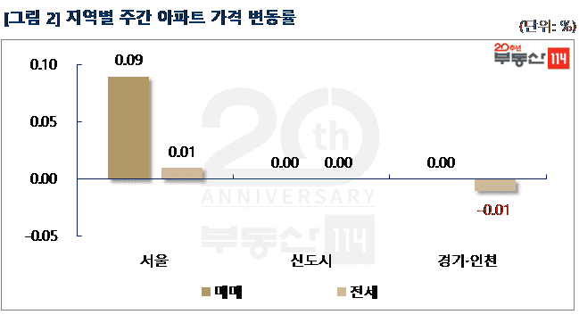 부동산114(www.r114.com)에 따르면 금주 서울 아파트값은 0.09% 상승해 지난 주(0.10%) 대비 소폭 둔화됐다. 재건축이 지난 주 0.30%에서 이번 주 0.11%로, 0.19%p 축소된 점이 영향을 미쳤다. 신도시와 경기ㆍ인천의 매매가격은 별다른 움직임 없이 보합(0.00%)을 기록했다.