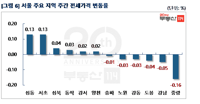 서울 전세시장은 △성동(0.13%) △서초(0.13%) △성북(0.04%) △동작(0.03%) △강서(0.02%) 지역은 상승한 반면 ▼중랑(-0.16%) ▼강남(-0.05%) ▼도봉(-0.04%) ▼강동(-0.03%) ▼노원(-0.03%) 등은 하락했다. 성동은 하왕십리동 왕십리센트라스와 금호동4가 서울숲푸르지오가 500만원-1,500만원 올랐다. 서초는 서초동 진흥아파트 전세가격이 1,000만원-1,500만원 상승했다. 반면 중랑은 상봉동 LG쌍용이 1,000만원-2,000만원 떨어졌다. 강남은 수서동 강남더샵포레스트가 대형면적을 중심으로 2,500만원-5,000만원 빠졌다.
