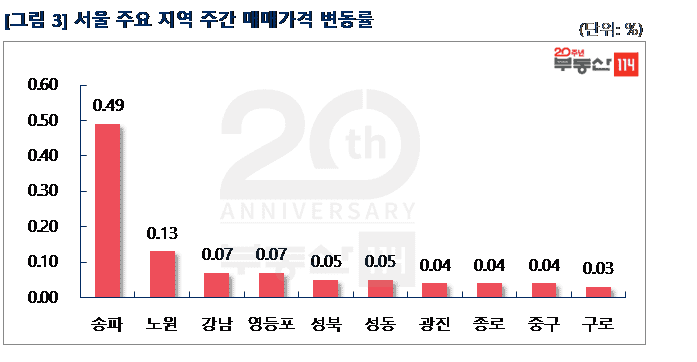 서울은 △송파(0.49%) △노원(0.13%) △강남(0.07%) △영등포(0.07%) △성북(0.05%) △성동(0.05%) △광진(0.04%) △종로(0.04%) 순으로 상승했다. 송파는 분양가상한제 시행을 앞두고 재건축아파트의 상승폭은 둔화된 반면, 일반아파트는 공급 희소성이 높아질 것이라는 기대감에 상승세가 커졌다. 잠실동 트리지움과 리센츠, 신천동 잠실파크리오가 1,000만원-5,500만원 올랐다. 노원은 공릉동 노원프레미어스엠코, 상계동 수락산1차우림루미아트가 500만원-1,000만원 상승했다. 영등포는 당산동 삼성래미안4차, 성원이 1,000만원-2,000만원 올랐다. 강남도 기존아파트의 상승이 두드러졌다. 역삼동 역삼푸르지오, 개나리래미안, 대치동 래미안대치팰리스 등이 1,000만원-2,500만원 뛰었다. 성북은 종암동 종암2차SK뷰가 1,000만원-1,500만원 상승했다.