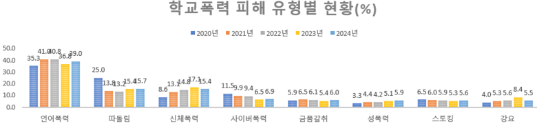 마찬가지로 학교폭력 가해 응답률과 목격 응답률도 지난 5년 간 증가해왔으며 그 추이는 아래 표와 같다. 특히, 학교폭력 목격 응답률의 경우 2020년 대비 3.1%P나 증가(’20년 2.1%→’24년 5.2%)한 점이 눈에 띈다.