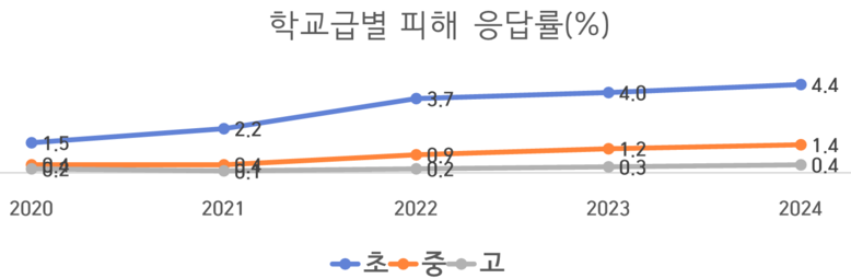 피해 응답률을 학교급별로 분석해본 결과, 초등학교, 중학교, 고등학교 모든 학교급에서 피해 응답률이 지난 5년 간 증가해왔다는 것이 이종환 의원의 설명이다. (상세 : 아래 표, 그래프) 특히, 초등학교의 경우 피해 응답률이 2020년 대비 2.9%P나 증가(’20년 1.5%→’24년 4.4%)하여 그 심각성을 더한다.